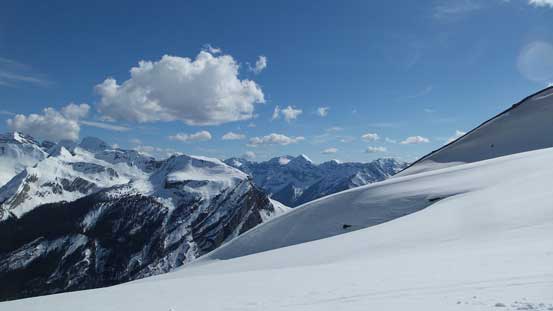 At this point I was hoping for a “snow platform” as a natural break between the couloir and the face, but I was wrong. By staying way on the climber’s left side there was no break. The SE Face followed immediately after the exit of the S. Couloir, so the snow climbing continued on. Unfortunately the sun really came out at this point beating down the rime covered rocks around us, and as a result the rime started to fall off. Ben was the unlucky one and got a cut on his hand and lost his sunglasses. Fortunately the snow was perfect here for step-kicking so we could make progress fairly efficiently. Higher up on the face the slope angled increased to the steepest. By lifting my legs upwards my knees were touching the surface so that’s how I knew it’s probably steeper than 45 degrees for a short while. Further up the angle eased a bit and we trended climber’s left, broke through the final cornice, and soon stood on the top. The views were fabulous towards each direction, but we knew the descent would be just as challenging if not more.
