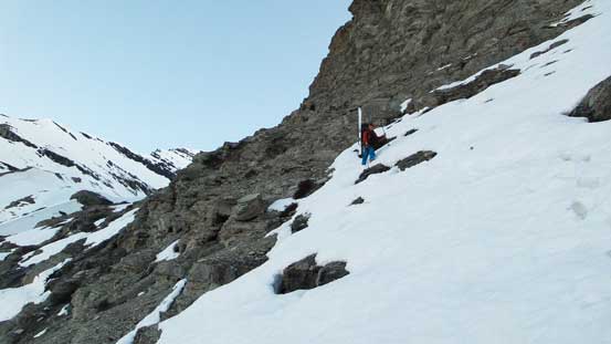 The next section was an ugly side-hill bashing back towards the proper ascending drainage. Considering what we’d done on Alexandra’s approach just across the valley, this was nothing by comparison. But still, carrying ski/snowshoe and winter overnight mountaineering loads made it quite a quality suffering. We managed to maintain a gentle uphill diagonal traversing line. Around a corner (with a cairn) we crossed a steep snow slope, and the next section would be some moderate scrambling on loose rocks. This part was as expected, pretty shitty but with good perseverance we made it through. All the snow we encountered here involved deep post-holing on isothermal crap which added to the “fun” factor. The upside was that sketchy waterfall crossing was trouble-free for us as we just had to walk across a snow slope. And shortly after that we arrived at the cirque below Bryce’s S. Couloir. We decided to camp at the exact same place as Trevor did. The bonus was to use their site as a well-built kitchen!!
