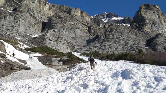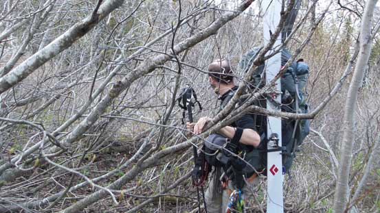 The sky was clear overnight so we did get a bit of a freeze, but only for the upper few cm’s anyway. We woke up at 4:30 am and started about 1 hour after. Ben somehow convinced himself to ski (actually, side-slip) the steep and icy slope immediately below our camp and then across the waterfall. I just boot-packed down with occasional post-holes. Then came some top quality-suffering negotiating the ugly side-hill scrambling bash, while carrying heavy loads including skis and snowshoes… And then came the lower avalanche path. Apparently there was a huge slide on the previous day adding a whole lot of new debris. Ben tried to ski down the first section and we all boot-packed down the second half. Walking on the ice boulders was kind of fun though. Lower down we stayed too far skier’s right and had to bash through a brief, but very dense alder zone…