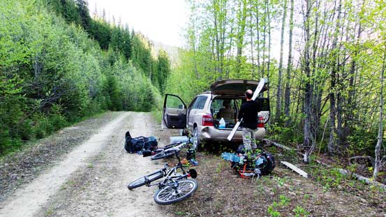 Having some fresh beta from Trevor’s trip we new roughly what to expect and came prepared with a saw (not a proper chainsaw, but good enough to cut a small tree) and mountain bikes. We left Edmonton by 4:30 pm on Saturday, drove all the way to Golden and then up the Bush River FSR. At roughly kilometer 80 we came to the first obstacle – a rockfall area with some boulders on the road. We moved them away and continued on. At kilometer 89 we came across those two big tree trunks that stopped Trevors from driving any further. We got extremely lucky that someone else just saw’d them for us so we continued on, across a critical bridge and onto the narrower side branch – the Rice Brook Road. We weren’t expect to drive all the way to its end but we were hoping to drive to where the Rice Brook canyon started. After cutting a fallen tree (medium sized) and then negotiating around a snow patch we had no choice but to call it a quit since there’s a huge tree trunk that we’d have no way to cut without a chainsaw. That’s still okay though as we just had to bike the rest 3 km or so. It was already 2:30 am and we decided to sleep in.