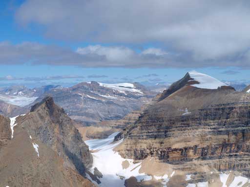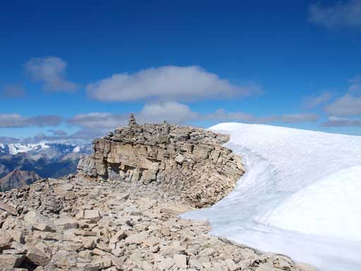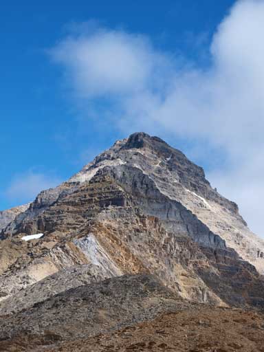 Given the elevation gain and difficulty, we didn’t expect this mountain to be that popular. There were tens of cairns guiding the way. After some moderate terrain, we encountered a cliff band that I could remember from Marko’s trip report. We followed a faint path towards a cairn on climber’s left and circumvented this band. We re-gained ridge crest by going up a gully afterwards. With good route-finding skill, this mountain is merely a consistent moderate scrambling for 500 vertical meters. Even so you still have to treat it as a difficult scramble, just like considering Mount Fox as a climber’s scramble because it has consistent difficult terrain for 600 vertical meters. At one point, we detoured slightly towards climber’s right, cut back to ridge crest, then traverse horizontally climber’s left aiming for another cairn. We followed cairns further towards left and re-gained the ridge by a long loose gully. This part sucks and reminds me about the scree-bashing on Storm Mountain Banff… Now we were treated with a snow field / glacier on the east side of the ridge, and the summit wasn’t far by this point.