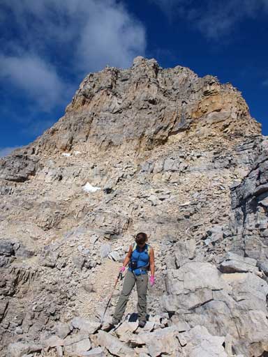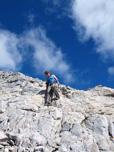 After some quick photos we started circumventing the west side of Hamilton Lake. There’s a trail but at one point it gets dangerously close to the lake. It reminded me the trail around Aster Lake… We soon started the slog up the lower talus / grass slope. We basically followed the verge of grass, but were using talus actually. The ground wasn’t loose so it didn’t matter which line we picked. Further up, we encountered a cliff band. We tackled it head-on and got some moderate scrambling for warm-up. After this, I went up towards climber’s left aiming for less steep terrain, while Andrea aimed further climber’s right directly towards the ridge crest. Both routes worked out and we made up the ridge at almost the same time.