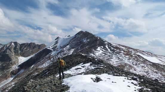 The ascent of Mt. Clairvaux from Frontier/Clairvaux col went easy initially on easy boulder field but soon enough the boulders started to get really big and unstable. There’s quite some hands-on scrambling just to negotiate those boulders but more “fun” stuffs were yet to come. Just when we thought we were close to the first high point the terrain suddenly became slabby and exposed. With fresh snow the slabs were wet making some tricky route-fining. But nothing super hard at this point yet and we soon made to the first high point. The far end appeared at the same height and checking my GPS it did say the official summit was on the far end so we had to traverse over.