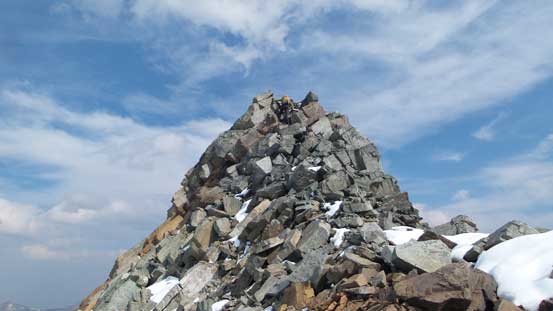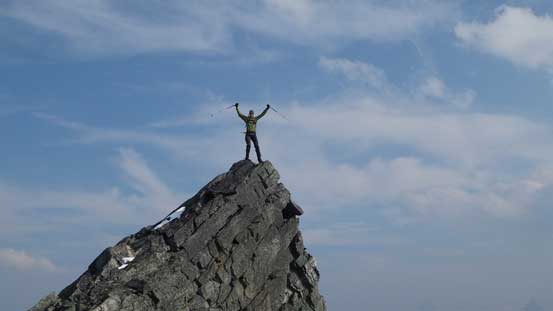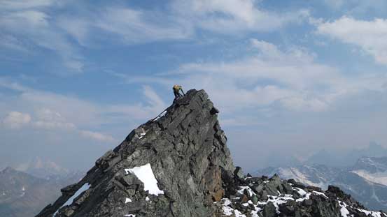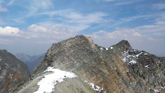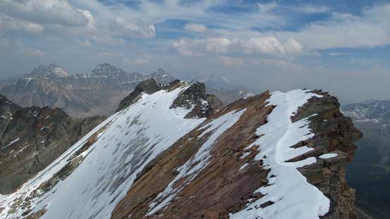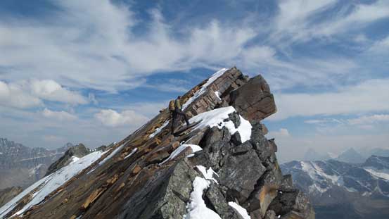 Up the far side the terrain was easier, but still mostly 4th class and fairly exposed. The E. end of Mt. Clairvaux actually had two summits close to each other and we again, couldn’t tell which was higher, so went up both. Getting down to the saddle was loose but not overly tricky, but getting up the second summit involved again, some exposed slab climbing. Looking back I’d say the first peak we ascended about 1 hour earlier was probably the true summit of Mt. Clairvaux, by my GPS did indicate the one we were standing on being the “official summit”. In the end no matter what I could safely claim this peak now so that’s good. But now the question was how to get down this thing…