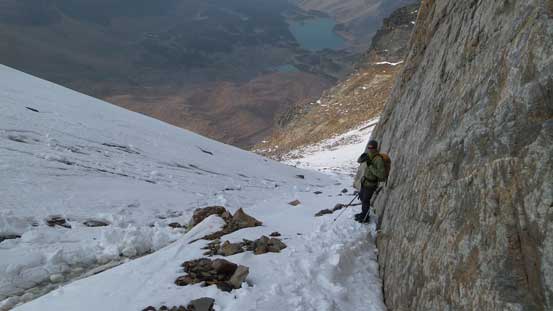 I didn’t feel like traversing all the way back across this jagged ridge unless I had to, so we looked around for some other routes. We did spot a line that if we continued down this ridge to the next saddle we could possibly get off the mountain by an icy gully to the skier’s left. That would dump us into Fitzwilliam Basin and knowing there’s a trail somewhere in the Basin we could then hike all the way out. We did bring crampons but no ice axe, but having the experience on Sir Douglas I knew I could handle some low-angled ice without an axe. So down we went. Some tricky maneuvering we made to the saddle. Crampons on and Maury went down first, and soon paused struggling to find a good hand hold on the wall. The words I got from his was “this’s super dangerous, make sure you really take your time”… Oh well, considering Maury is a WI6 ice climber that did not help my confidence… But again, the terrain looked awfully similar to the dirty glacier I down-climbed on Sir Douglas, just a bit steeper and with a bit more dirt at the start. The first 5 meters or so felt indeed very insecure, but once hitting the “real ice” I got the flow and managed to front-point down fairly quickly. Once off the snow/ice we still had a field of glacier debris and boulders to descend and that felt super tedious at this point.
