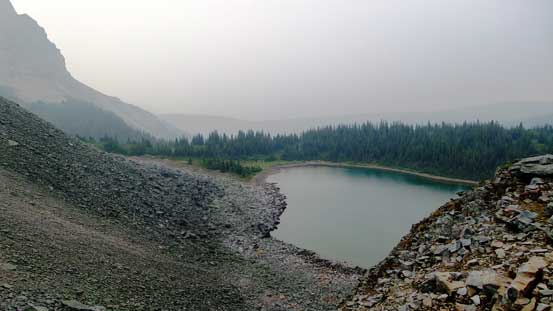 Down into the basin we had more boulders to overcome, but our real problem was not knowing where exactly that trail went. We weren’t planning on this loop traverse so I did not do any research of Fitzwilliam Basin other than knowing there’s a trail (apparently not in the best shape) somewhere. We ended up going too far skier’s left (West) but eventually I called the mistake and we took a shape turn to the right, traversed around a tarn and found cairns and paths which eventually led us to the main trail. This trail was in a rough shape with lots of indistinct sections on boulder fields or alongside creeks. Down into the wood the majority of the travelling was on boggy ground. Thankfully the mosquitoes were mostly dead at this time of a year otherwise it could be horrendous. I did not enjoy this trail at all, neither did Maury, but with good perseverance we made back to the campground, just before it’s too dark to see.