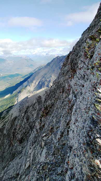 The last push towards the summit looked like a huge pile of horrible scree but wasn’t too bad. The slope was not as steep as it appeared but partway up Vern and I started to trend climber’s left towards the ridge anyway. We were treated with some good views and better rocks. The drop-off down the west side was huge! Our summit stay was short thank to the coldness.