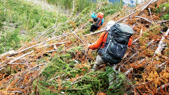 Going down we picked a different line following Eric’s route which saved us some distance and elevation gain. Than we leisurely walked back to camp. At this point we already made the decision to ascend Smith Peak on the following day and having the entire afternoon ahead of schedule we should knock the approach off on this day. After a well-deserved lunch we broke camp and started the return. While the return was not long it did involve some miserable bushwhacking. We thought we’d picked a better line by staying skier’s right of Harrison Creek but that avalanche debris field was huge. No matter what line we chose we had to deal with ugly dead-falls. Eventually we picked up the trail again and walked back to the truck.