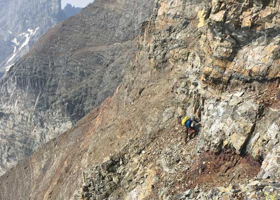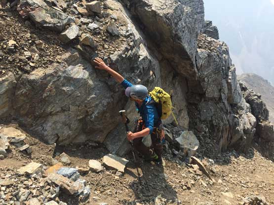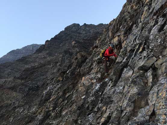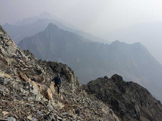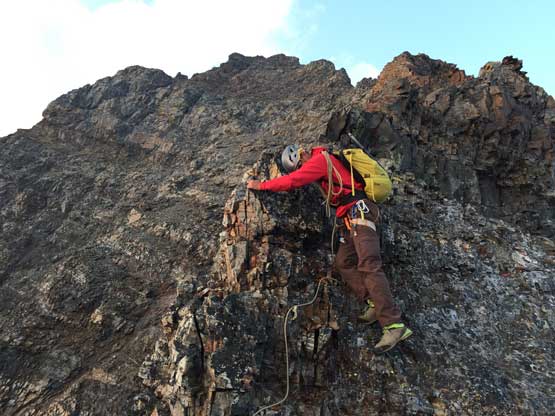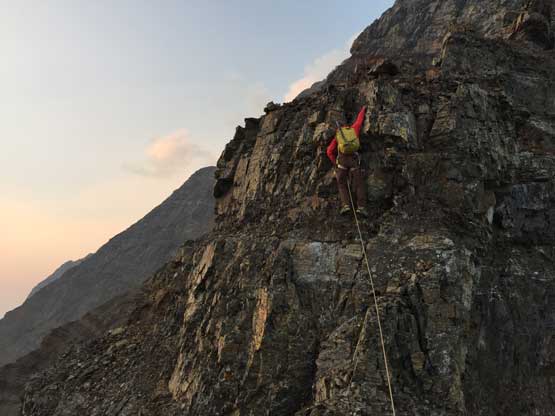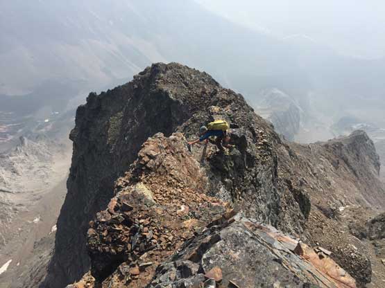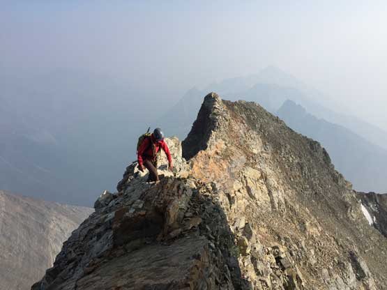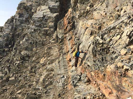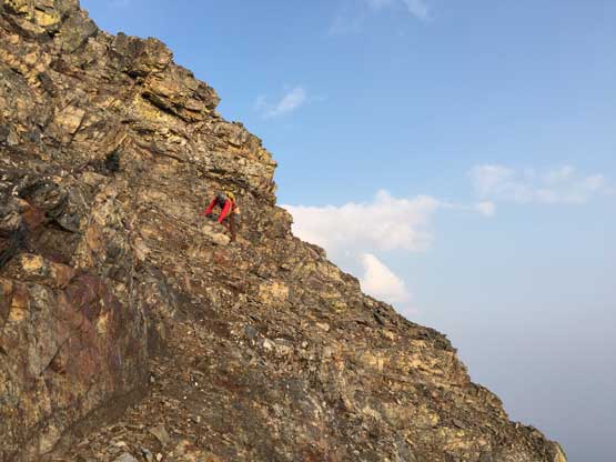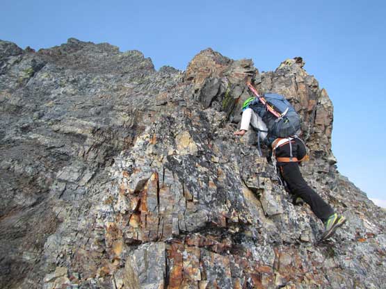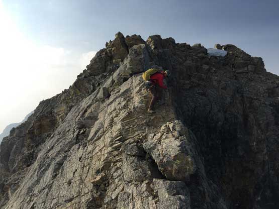 Down-climbing a tricky step along the uppermost summit ridge. Exposed as fuck..
