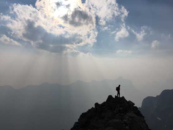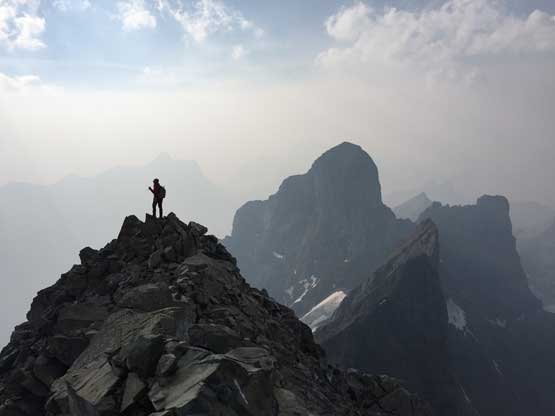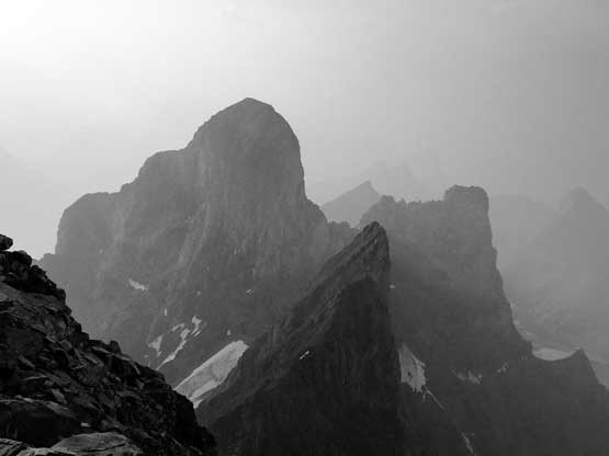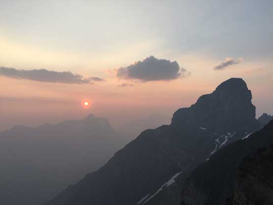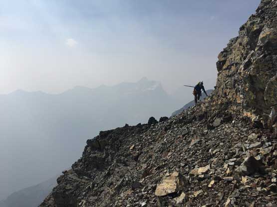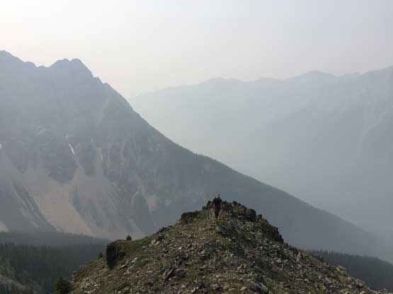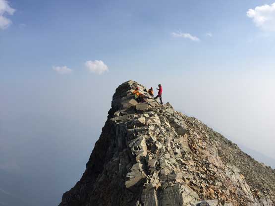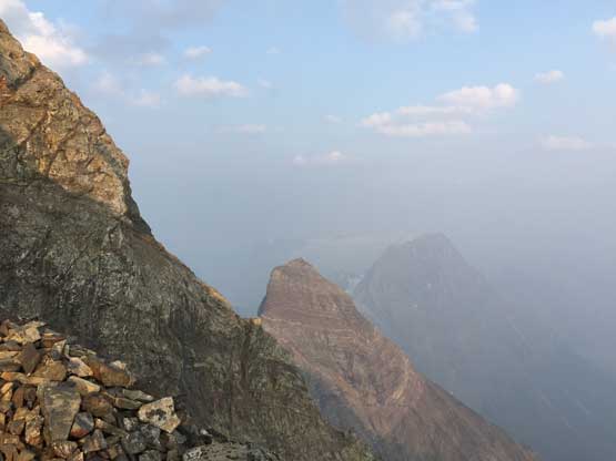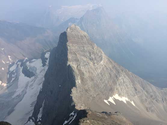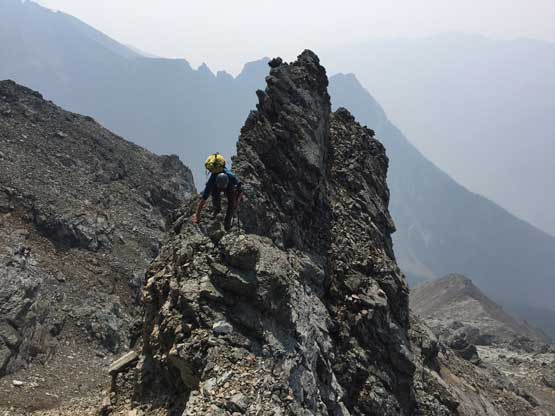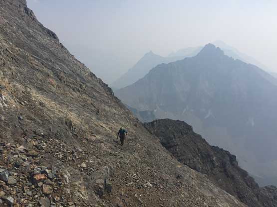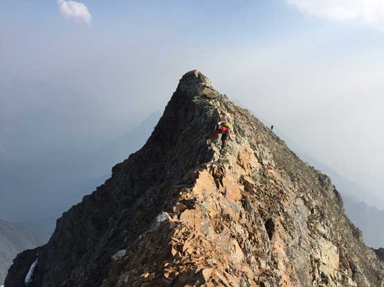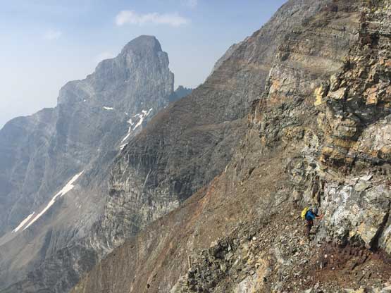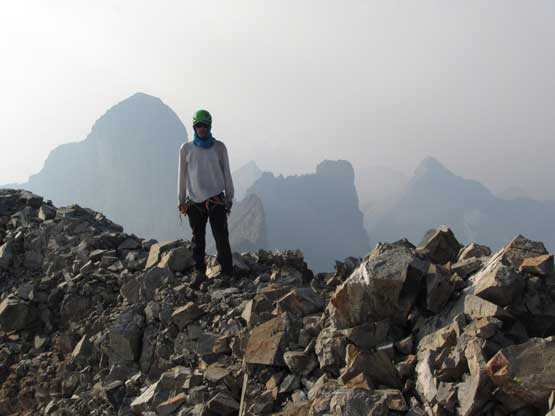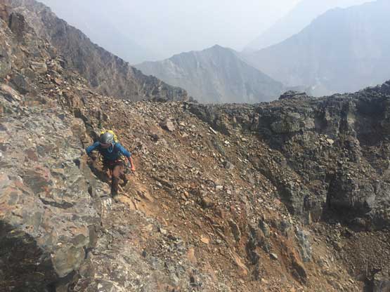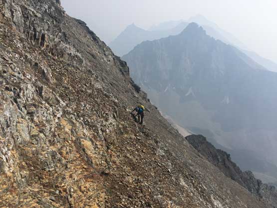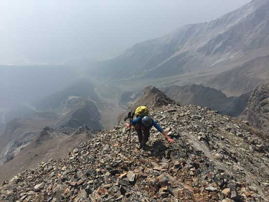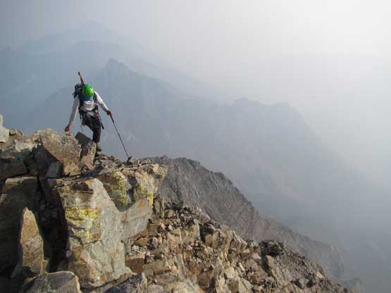 While working across this orange ridge Michel and I had been watching Blair, Jim and Raff’s progress and the way they struggled across surely didn’t boost our confidence. This is the upper crux – a knife edge orange choss with width of a feet, but exposure of over a thousand meters down each side into death… The orange rocks were so bad that after trying to tip-toe balance I gave it up, kneed down and applied that technique of au-cheval. There’s no handhold to grab whatsoever and this part certainly makes the crux traverse on Mt. French like a wheelchair accessible walk… The technique of au-cheval worked perfectly for the couple narrowest spots. We were doing good… The South Tower of Mt. Goodsir was almost in the bag, but we had one last barrier ahead – the summit block… Blair said the summit block was actually easier then the rest of this mountain and I agreed. The route-finding was mostly on the shaded NE Face’s down-sloping ledges but the rock quality had improved. The climb was again, 3rd to 4th class but with “solid” rocks we topped out on the uppermost summit ridge in no time. There’s more knife-edges on choss but comparing to the earlier cruxes this was “nothing”. The next thing, we were standing on my 51st 11,000er chocking in the smoke.