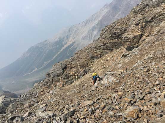 Traversing onto the lower SW Ridge on unpleasant terrain