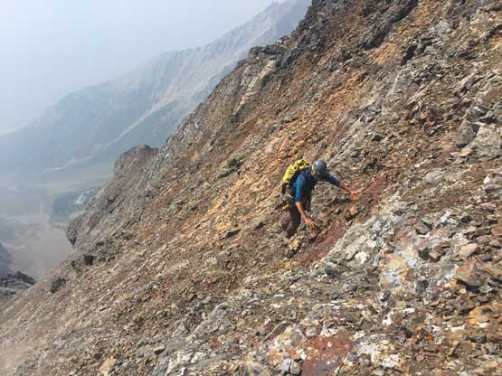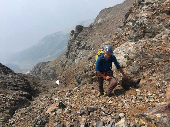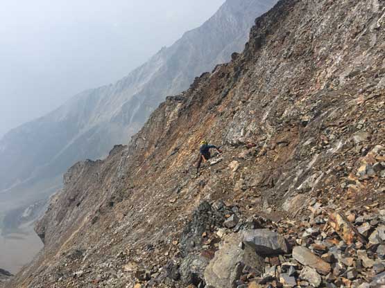 It’s hard to describe how shitty this pile of garbage is. Term “loose” is relative. Had I climbed pitches with worse rocks? Of course yes, but combining the looseness with the type of terrain, sustained exposure and the length of this climb, and the fact one needs to down-climb the entire mountain I cannot think about another peak coming close to this level. Perhaps Mt. Alberta is the only other one, but on that pile of junk one only climbs half of the mountain on the sharp end of a rope, and the entire descent is by pitch-to-pitch rappelling. The ascent of South Goodsir is very different. Although largely non-technical, for about 600 vertical meters on the upper climb one cannot afford a single mistake and this quickly becomes a mentally exhausting game. Even the most capable Canadian Rockies mountaineer needs luck to be on his/her side in order to survive the Goodsirs, particularly the infamous South Tower. However I have to point out another perspective of this climb, that is from the scramblers’ point of view. The most important skill you need to have on South Goodsir is “scrambling” and the second most important is your fitness, in my opinion. I wouldn’t be surprised if a bold and single-minded Canadian Rockies scrambler (without mountaineering background) shows up, crushes the south tower and states it’s “nothing more than a glorified scramble” because I do agree with this in some way.