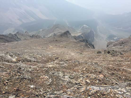 It was past 6:30 pm, at least two hours earlier than our expectation. We earned ourselves time. Despite the sustained choss and exposure neither Michel nor myself had issues on this type of terrain. We had cruised to the summit in just over 6 hours since leaving camp and I have to say we were absolutely crushing it. The other team started 6 hours earlier than us and now was only one hour ahead. Michel and I signed the register and immediately started the descent. Despite the requirement of 120% concentration I knew I was able to get down most of this peak without a problem except for that snow gully (which I needed a different line). I knew that much of this descent would be a test on one’s crab-walking and side-stepping skills, and having hauled a trekking pole all the way to summit surely would help. Down-climbing loose 3rd-4th class is my absolute expertise so if others could make it down then I could too… It sure turned out pretty easy. In no time we were off the summit block and then back across the upper orange crux… Down into that gully-of-vertical-dirt was not very pleasant but “side-stepping with a pole” for the win.