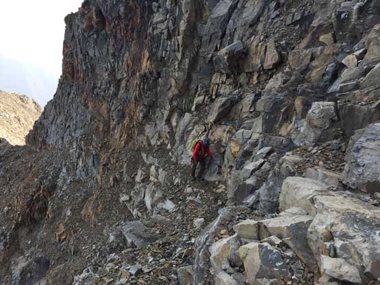 This lengthy traverse across the bowl gradually dumped us onto a left (west) branch of SW Ridge and for a short while the exposure had eased a bit, but only for a short while. A steep buttress in front forced us to traverse diagonally climber’s left hoping to find a line working around. On the descent we found an easier way but on ascent we took a roundabout line zig-zagging back and forth, but we did manage to keep the ascent in the realm of “3rd-4th class” up until this point, but soon the first crux would arrive… Just as we topped out on the higher branch of SW Ridge proper a series of jagged towers erected in front with no obvious way to bypass. A large cairn indicated we were indeed on route and that’s also confirmed by Ben’s GPS track. I felt it’s hard to believe we actually had to climb up and over those towers as both sides’ exposure was unreal. The rocks were still beyond legendary and the width was no more than two feet. The scrambling was 4th class sustained with a few low-5th steps. Needless to say we both gave 120% concentration and meanwhile, moved at a snail’s pace. Although mentally taxing we cleared this part without a problem. The next stretch was still ultra exposed but at least the scrambling difficulty had slightly downgraded.