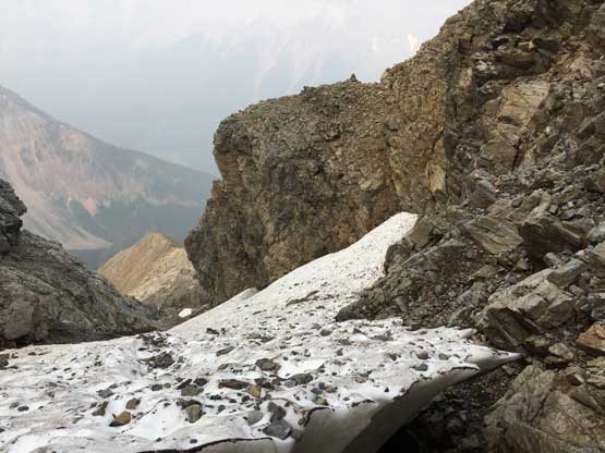 The improvised bivy site worked pretty well and both Michel and I got some decent hours of sleep. The morning was pleasant in the sleeping bags that none of us wanted to get out. Eventually we had to force ourselves out of the warmth and in order to get going I cooked a cup of hot coffee for us. Meanwhile the other group was struggling to find a way down bypassing the snow gully. Later we learnt that Jim didn’t even have an ice axe so that made sense, but the route they were trying looked terribly hard from our vantage point. In about 2 hours they didn’t make much of a progress but Michel and I had our own concern too. After a clear night we had worry that the snow might froze and neither of us had crampons. We didn’t have much of a choice other than hoping it’s not frozen so down the gully we went. Towards the transition onto dirty ice and snow I insisted to leave a quadruple cord behind for a rappel. The 30-m rappel got us onto the snow and I was relieved that the snow hadn’t gone a freeze. We did a belayed pitch using natural anchors down squeezing inside the moat and cleared this section with no mishap. Meanwhile Jim and Raff were still on their process to find a reasonable way down. I had some concerns but we trusted their experience so headed off the lower mountain on our own. Blair was waiting patiently at camp and we spent over an hour there catching up.
