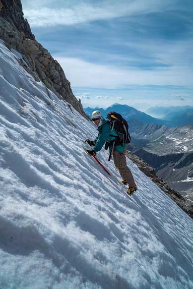 To optimize the snow condition we didn’t stay long on the top as the sun already started to shine on the south facing slopes. Down-climbing the couloir was fun and fast. Snow had already softened a bit so we even managed to walk facing outwards down most of the glacier. Towards the end we still had to traverse facing inwards though for 20 m or so. Traversing back across the ledges went without incidence and descending the big pile of scree was fast fun and we were back at King George/Princess Mary col in short time.