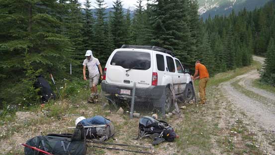 Our plan was to approach to the bivy site at upper left branch of Fynn Creek on Friday evening and this would give us two windows to attempt King George – the mornings of Saturday and Sunday before heading out and driving back home. If we managed to get King George on the first try then we’d use the rest of this trip to bag other smaller peaks in this area. In order to do so we had to leave Calgary by 1:30 pm the latest. The driving direction is well documented in the 11,000ers book and it follows Settlers Road, Kootenay-Palliser FSR and then Palliser River FSR for a total of 59.7 km to a small pull out by Fynn Creek. Vern did a great job driving and we arrived at the parking area at a reasonable time.