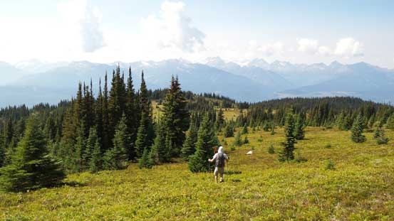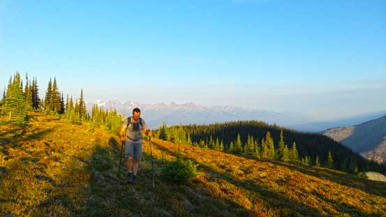 We drove up the approach road, 5 mile road. It’s very steep but not very rough thank to the recent maintenance. It brought us high up the slope above the valley floor, dispatching a great amount of elevation (more than 500 vertical meters) from our summit day. I bivyed outside the car and had a nice sleep. The next morning we woke up at the first light and started shortly after. The hike was on a well defined trail, but instead of going up, we had to lose some elevation first – probably the theme of this route… Once starting going up, we gained elevation steeply up the forested rib. The trail brought us eventually to a junction. The left turn goes towards a YORA lodge and we’d go straight ahead. Upon reaching a hill and meadow area the trail started to peter out and soon disappeared. Thankfully we were able to follow flags and picked up the trail on the opposite side. The view from this meadows was already amazing. Looking back we could see a whole panorama of the Cariboos including the highest – Mt. Sir Wilfred Laurier.
