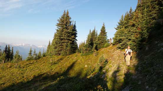 We knew the descent would be tedious due to all the uphill sections, but oh well. At least the terrain was generally pleasant, unlike the previous day. Going back up Carson’s Peak was the most significant elevation regain. Back down to the meadows we met Patricia, Rudi and their climbing dog, Pluto on the way up. After thanking them again for the route beta we continued down the trail.
