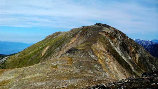 Then there came the next major elevation loss to a saddle. Ahead would be the steep grind towards Carson’s Peak. Here’s the official end of the trail and from now on it was on easy scrambling terrain. The ridgeline narrowed down higher up at an obvious rock outcrop. We circumvented this obstacle on the right side and re-joined the ridge shortly after. Then we stuck on the ridge crest overcoming a few steps. The route up Carson’s Peak was steep and loose. There’s a big cairn on the top but I couldn’t find a register.