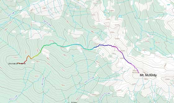 Mt. McKirdy is a prominent summit rising more than one vertical mile up from the town of Valemount. It’s not a particularly high summit but does look impressive viewing from the highway below. There’re numerous routes up its summit, all of which are technically easy but physically strenuous. Eric, Ben and I finalized our objective on this one after a successful ascent of Cinnamon Peak. We were looking for an easy outing due to the sore legs and the lack of motivation. We spent the previous night in Cariboo Grill and talked to Patricia (the local mountaineer Reiner Thoni’s mom). She had been up this peak many times and gave us some fresh and very detailed information. Basically she suggested to ignore the “McKirdy summit trail” described in the visitor’s brochure, but rather hiking up the McKirdy Meadoes trail followed by a long and scenic ridgewalk to the summit, overcoming a subsidiary summit locally called “Carson’s Peak”. That sounded perfect for us as we also wanted to have more views.