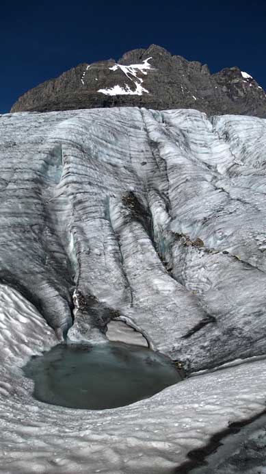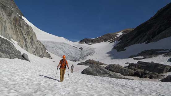 The descent went uneventful and we soon got back to Prince Albert/Prince George col. From here instead of going back via the same route we’d use a more direct line down the skier’s left side of this hanging valley. Obviously nobody had done any research about it. I remember seeing it being quite rocky from Princess Mary on the previous day but everything looked different from below. We walked down a gentle glacier staying way on the left side to avoid suspicious area, and then took the lower branch upon reaching the first junction. This brought us to the edge of the big glacier. We had to a bit more route-finding on the edge of this glacier but on the other hand, we were treated with some exceptional view of spectacular ice formation. I hadn’t done many trips on dry glaciers and I was very impressed. Lower down there’s even an alpine tarn adding to the scenery – would be a even better bivy spot for parties ascending Prince George.