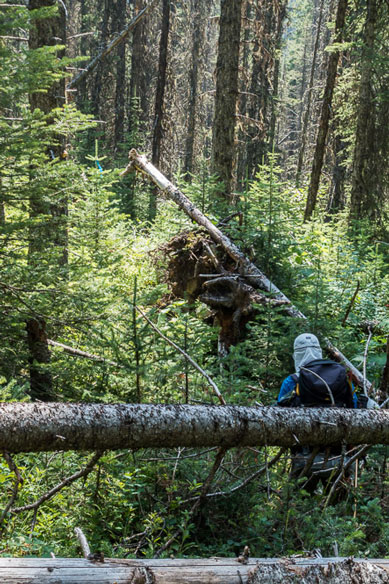 From here on the fun parts were over and I was not looking forward to the lengthy return. Hiking down the moraine back to camp was already tiring and hard on my knees… From camp downwards, the trail was extremely difficult to follow. The key was looking for flags. If you don’t see flags for 2 minutes you’re likely off route. There’re many paths leading the wrong way and some are even bigger than the correct trail. I think many climbers had struggled here just like us. We had to constantly check the GPS to make sure we were not off route. Descending the steep headwall was exceptionally miserable given the heat and the fact I was wearing full shank mountaineering boots… The hike out via Fynn Creek was even worse as we had to constantly backtrack or regain elevation due to washouts, hop over endless deadfalls and bushwhack through brushes. This is one of the parts I’d rather have rain than full on sunshine with 30 degree temperature. And towards the end we had to negotiate the last obstacle – arguably the crux of the trip – shaffling across the log…