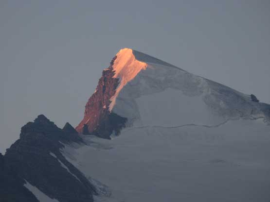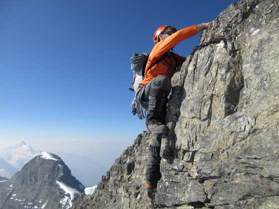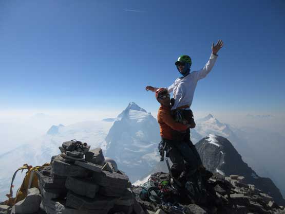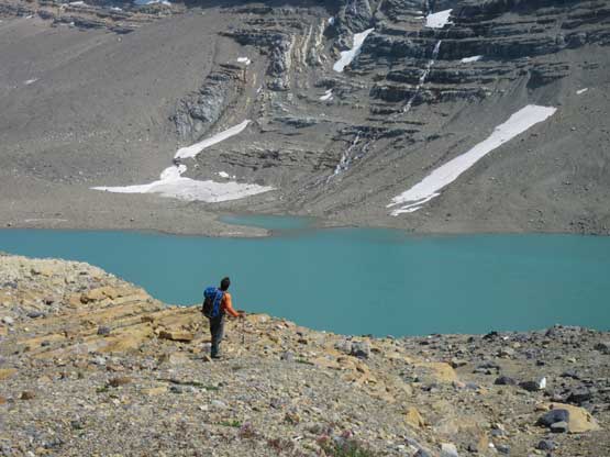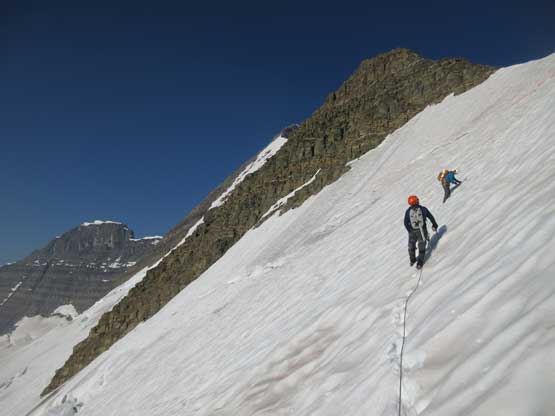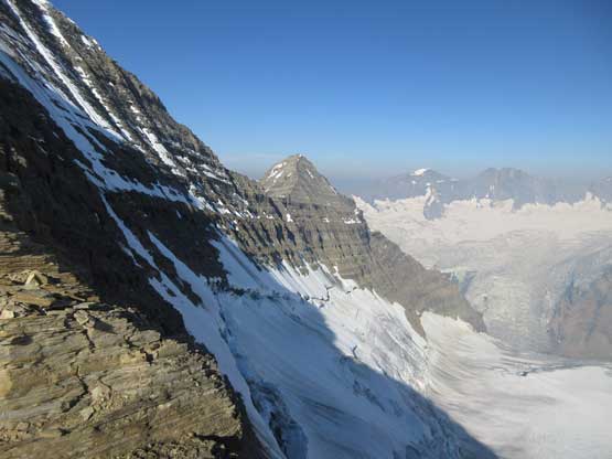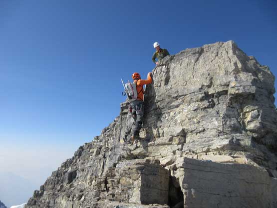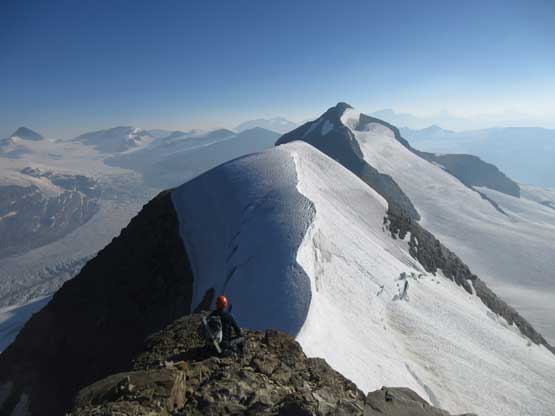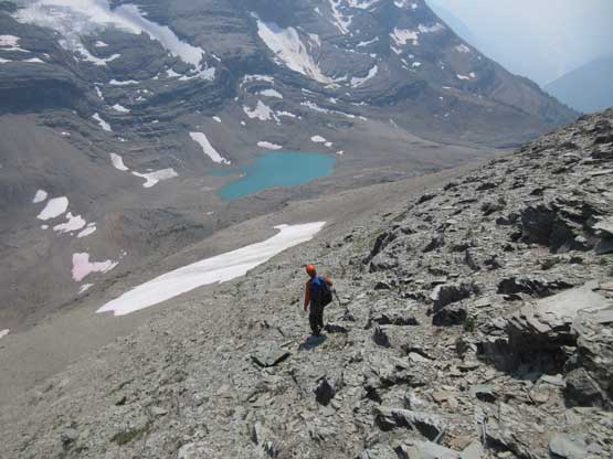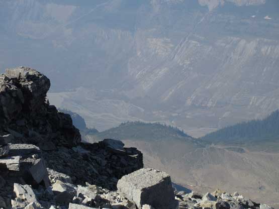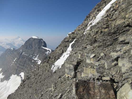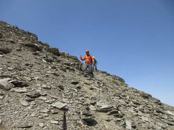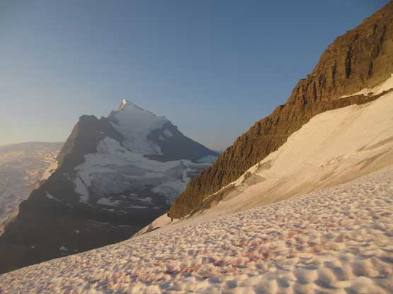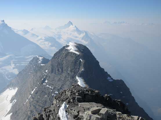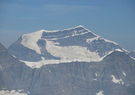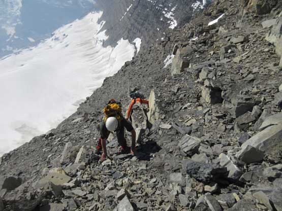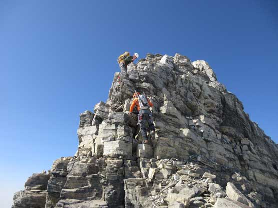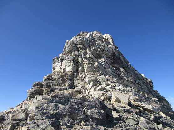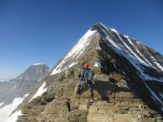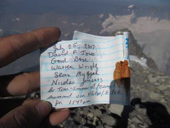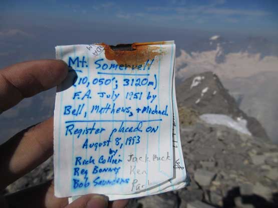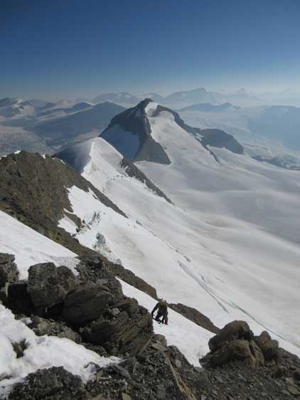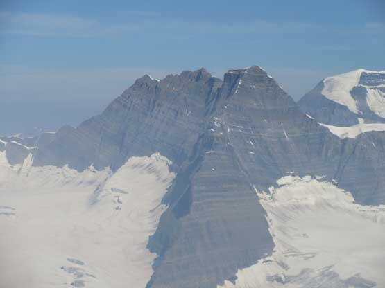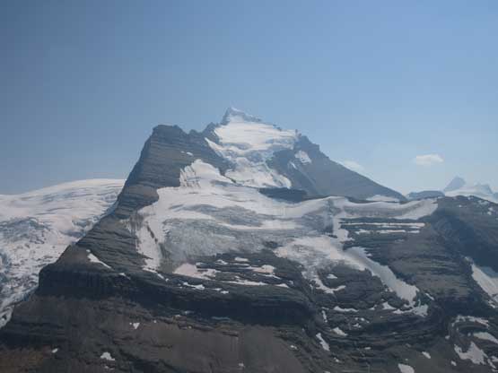 But we made across nonetheless and then the choss part began. Much of the climb on east face was a mere 3rd class “scrambling” but the terrain was not very pleasant. The colour and the layers of these rocks actually reminded me the lower part on Mt. Alberta so that states how loose this face is. However, loose rocks weren’t an issue for the three of us and we made quick progress up the face and crested the uppermost NE Ridge right above the snow arete. The arete was successfully bypassed just as planned. The hardest climbing was encountered on the summit ridge (5.3 ish) but the rocks are generally solid. We soloed the ridge no problem and the next thing we were on the summit celebrating another success. The register has only three entries – the F.A. party, Rick Collier’s group (1993) and then David P. Jones’ group (2007). We made the 4th recorded ascent of this majestic peak. Not bad, not bad…