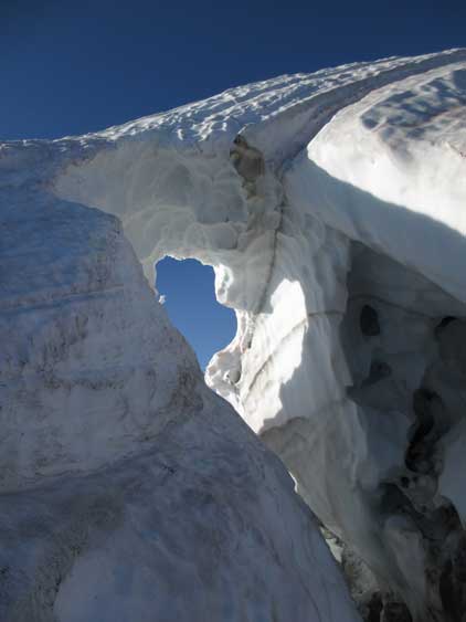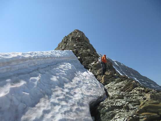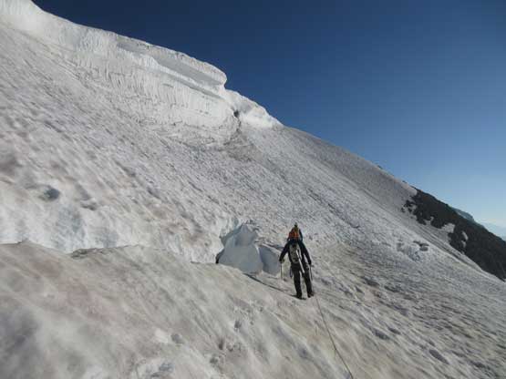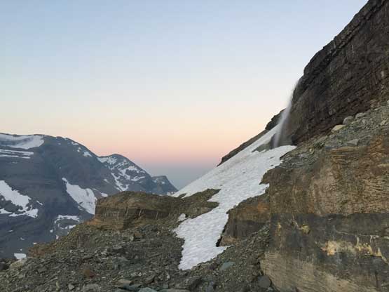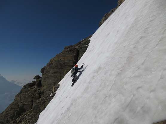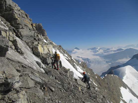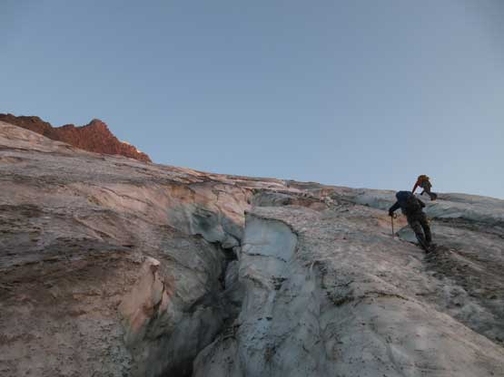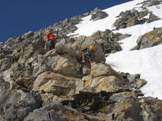 The first challenge was actually gaining that aforementioned col. At least two major crevasses required careful detouring and probing and the snow bridges were very questionable given the soft snow, but we did find a way around. A bit of steep climbing later we crested the col, but right on the col there’s another hole. To get around it we had to down-climb and detour on the north side. After that bit of excitement we were finally on the NE Ridge removing crampons and storing the ice axes. Climbing the lower NE Ridge was mostly 3rd class and the aim was a not-so-obvious ledge traversing across most of the E. Face. This ledge was much wider than expected and upon hitting its base we confirmed the previous decision of traversing all the way across this ledge. The crux was crossing a 45-50 degree snow gully. Even with two tools we did not feel super comfortable because of the slushy snow.