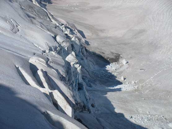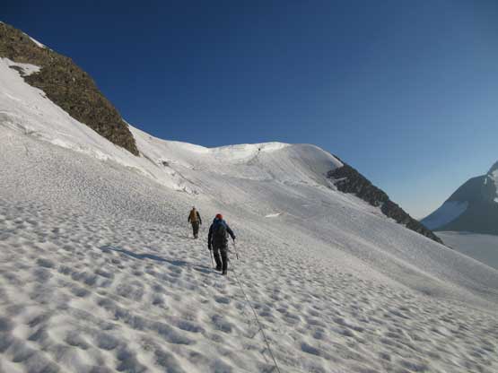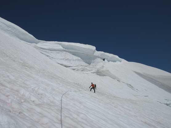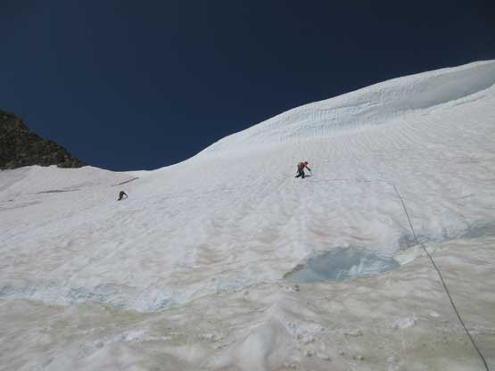 But even so a lengthy glacier travel was still required so we set the alarm at 4:30 am and started in pitch dark. We had just done the approach two days earlier so navigation in dark was no problem. We correctly found the waterfall gully and for some reason the ascent of this gully felt a lot easier than the first time I did it. The rocks were more solid because the loose stuffs were already knocked down. Upon hitting ice on the edge of glacier we decided to go farther out to climber’s left. The decision was to avoid that sketchy jump-across. We still had to deal with a bit of steep ice and a maze of crevasses but most of them were easily navigable. In short time we had arrived at the flat, snow-covered glacier and took a long break. Onward we aimed at the higher of the two cols connecting Mt. Ellis with Mt. Somervell.