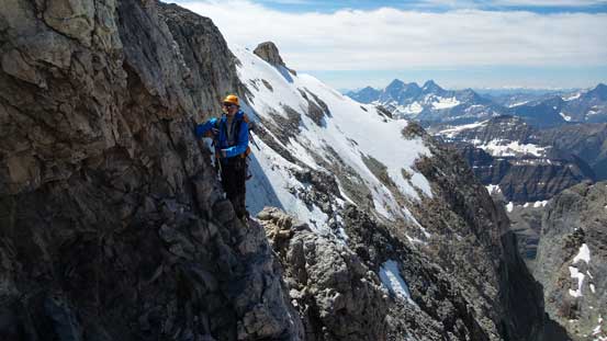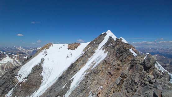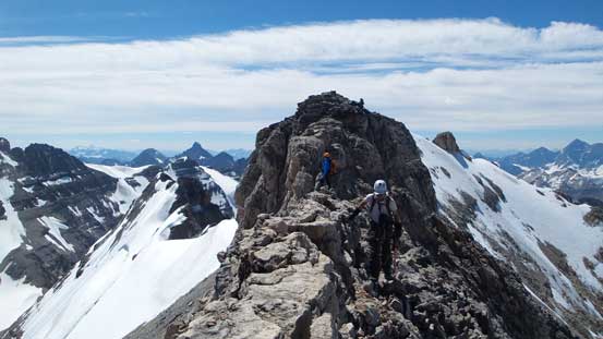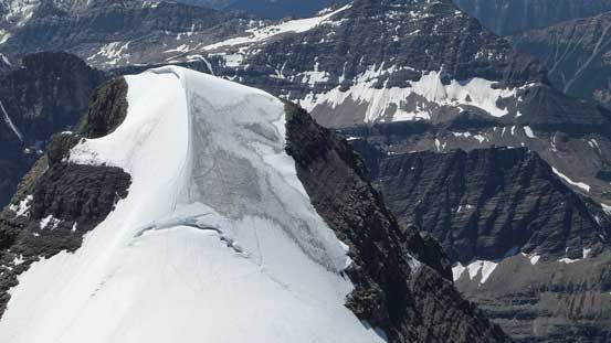 From here on to the summit of Mt. Victoria was nothing more than “easy mountaineering” for roughly 30-40 minutes given our conditions. All the rocks were scrambling only and the exposure was pretty tame despite what’s usually described by other sources. There were a few snow aretes to ascend but those were easy given our experiences on snow. I honestly thought the snow aretes on S. Ridge of Mt. Willingdon to be more difficult than Victoria’s, but that could just due to the perfect conditions we had. From the summit, Mt. Huber looked fairly icy but still presented snow climbing lines; Mt. Lefroy looked like ugly late-season conditions; North Victoria looked just like a bump on the ridge and the Victoria/Collier col was dry but the bergschrund was still filled in.