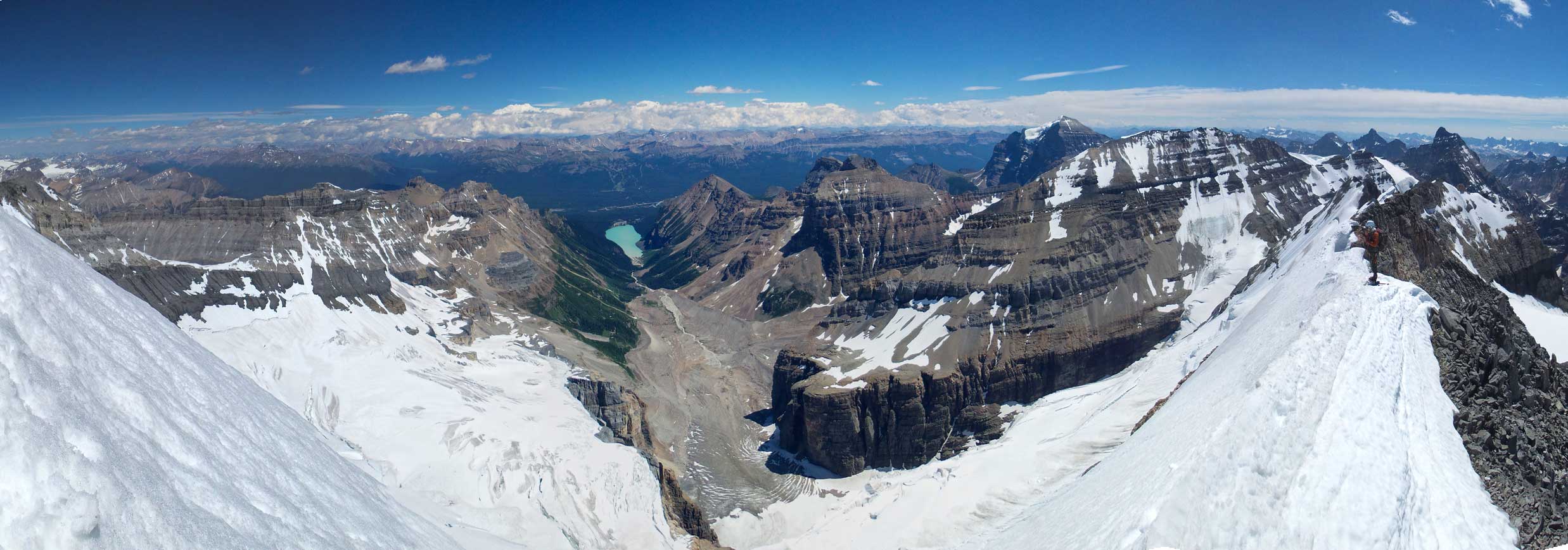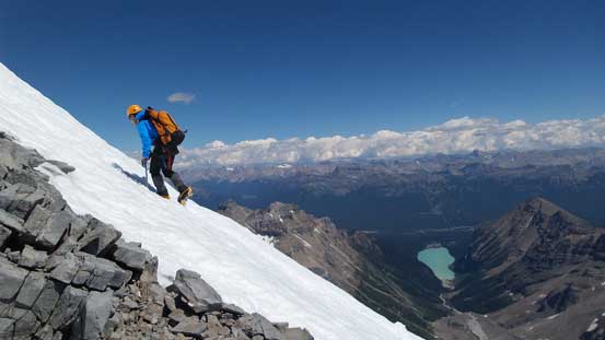 Now after finishing the Lake Louise classic snow-and-ice 11,000ers (North Victoria, Lefroy, Victoria, Huber) I actually think the main summit of Mt. Victoria is the easiest one (at least given the conditions we had). The other three all involved steep snow climbing but for Victoria it’s mostly a scramble with some easy snow and glacier travel.