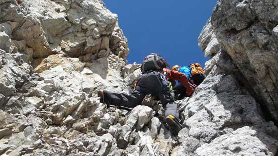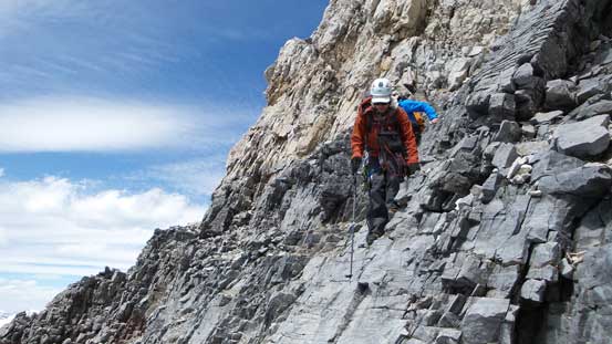 Some easy snow climbing after crossing the bergschrund brought us into a large gully system. We exited the snow on climber’s left side onto piles of loose rock. It’s almost impossible to avoid rock falls here and I knocked down quite a few chucks towards Ferenc and Ben just when transitioning onto the dry ground. From here it’s almost impossible to tell the exact route we took but by following basic sense we managed to stay entirely on (loose) rock avoiding the temptation to hit that icy gully. I believe the icy gully was the “normal” route according to Bill Corbett’s 11,000ers book, but as non-ice climbers we all preferred loose 4th class terrain. The terrain brought us to a tight chimney and after ascending it we topped out on the upper SE Ridge of Mt. Victoria.