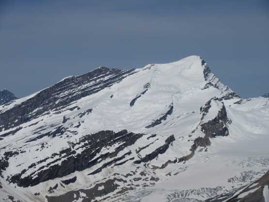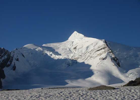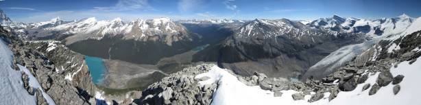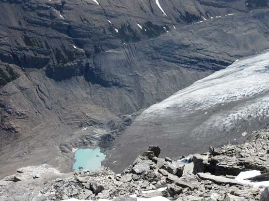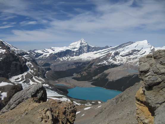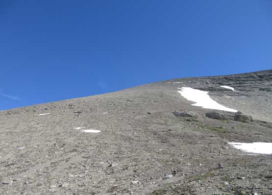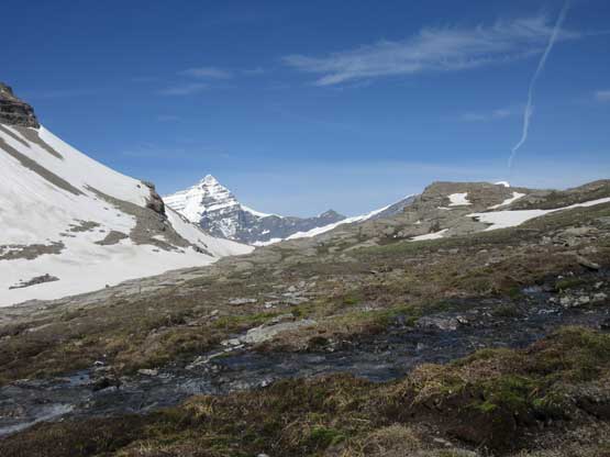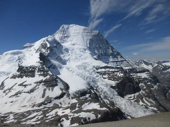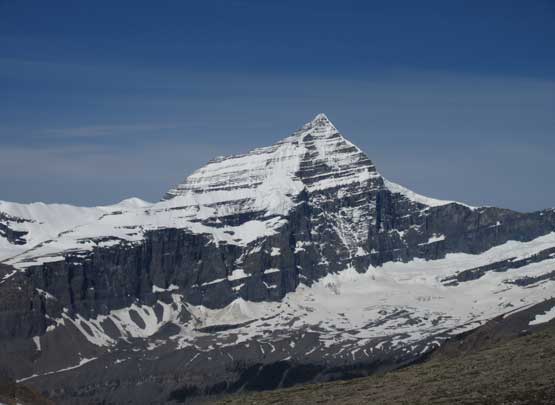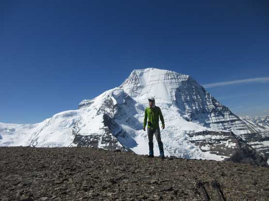 In the “backside” of Mt. Robson towering above the tourists’ central Berg Lake sits Rearguard Mountain. This is a very aptly-named summit because it guards Mt. Robson from the far side. The standard route up its south slopes has nothing magic other than a 400-meter of scree slog but getting to the start of the route seems problematic. In particular scramblers’ fashion one needs two full days just to get to Rearguard Meadows at the base and in addition to that, two stretches of glacier crossings are required. The position of this peak is great, and in fact too good to give a miss that on a clear day the summit offers some of the finest view of the north face of Mt. Robson. I did it as a side-trip diverging from The Helmet’s ascent so all of the approach and return is written in The Helmet’s trip report.