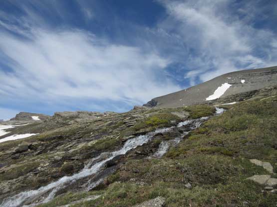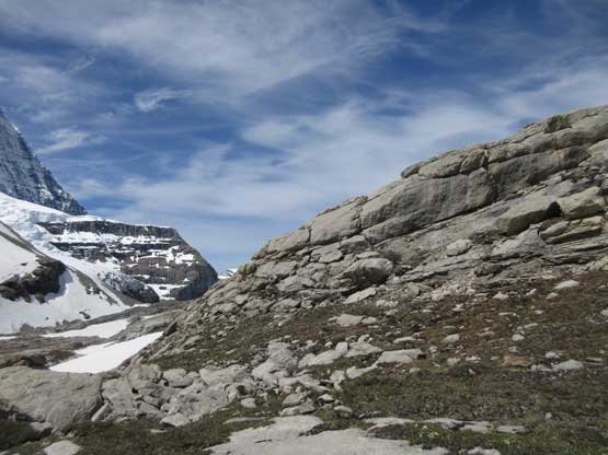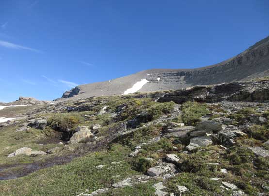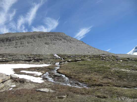 Ben and I camped on the eastern edge of Rearguard Meadows adjacent to Robson Glacier and from there it’s just over 1 km of cross country travel to the start of Rearguard’s south slopes. Ben decided to relax in camp because he has already been up Rearguard Mountain as part of his Resplendent’s ski trip back in April 2016. I did both Robson and Resplendent via Patterson’s Spur short-cut so previously never been to this area. Despite the 19-hour day we just had I was still keen. The cross-country section had a few stream crossings and the entire was was very scenic.