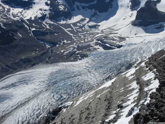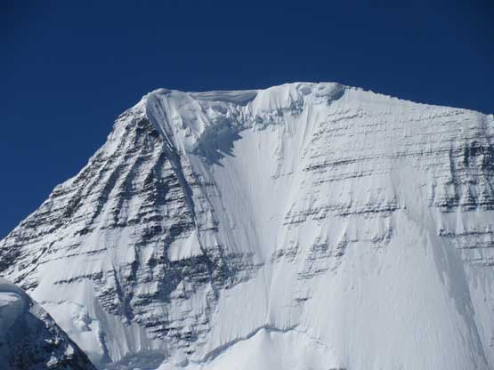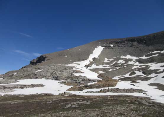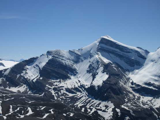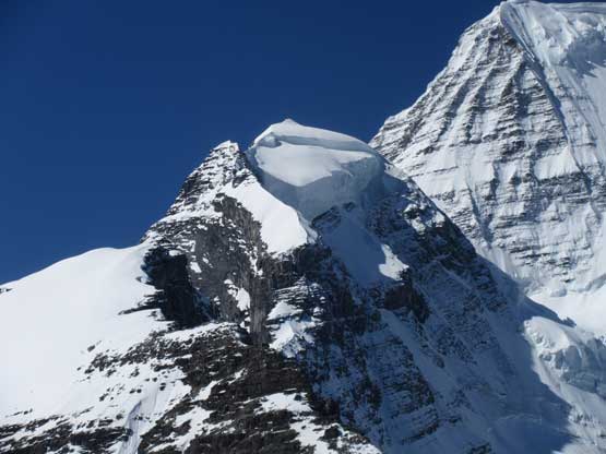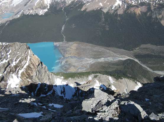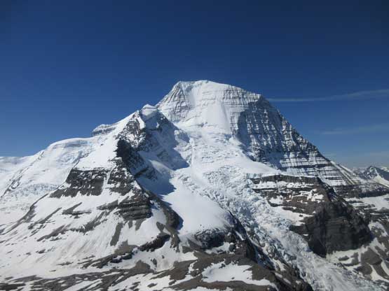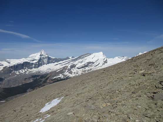 In the “backside” of Mt. Robson towering above the tourists’ central Berg Lake sits Rearguard Mountain. This is a very aptly-named summit because it guards Mt. Robson from the far side. The standard route up its south slopes has nothing magic other than a 400-meter of scree slog but getting to the start of the route seems problematic. In particular scramblers’ fashion one needs two full days just to get to Rearguard Meadows at the base and in addition to that, two stretches of glacier crossings are required. The position of this peak is great, and in fact too good to give a miss that on a clear day the summit offers some of the finest view of the north face of Mt. Robson. I did it as a side-trip diverging from The Helmet’s ascent so all of the approach and return is written in The Helmet’s trip report.
