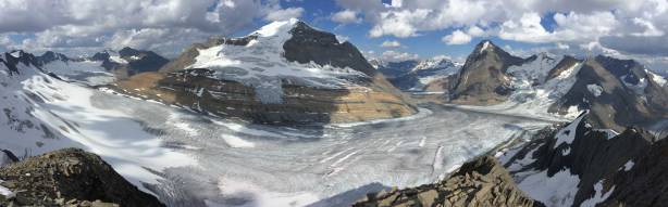 Reconnaissance Ridge is the smallest (officially) named summit on Clemenceau Icefield in arguably the most remote corner of central Canadian Rockies. This is a long ridge that splits Cummis Glacier to the west and Tusk Glacier to the east, and both glaciers are part of the icefield. The position is superb and the ascent is mostly a walk except for the last 100 m where some exposed 3rd class scrambling is unavoidable. Because the name of this summit is a “ridge” there’s confusion as where exactly the summit is. The ridge extends north all the way to Mt. Morrison/Mt. Sharp with no obvious “key saddle” to separate the peaks. I only did the southernmost peak along the ridge while I could see a few peaks to the north are slightly higher. This was part of the Mt. Clemenceau and Tusk Peak expedition so to read the full story you should read the other two main trip reports.