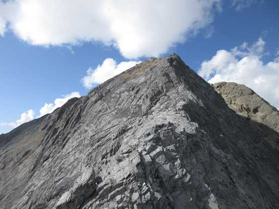 The start of the south ridge looked shitty but turned out not too bad. I thought there’s some rock-covered ice to deal with but the shit zone was very short-lived. The ascent onto the ridge proper was mostly on stable rock and the lower ridge also involved very little treadmill scree. Near the first bump/shoulder was where I started encountering isolated spots of “class 2” aka. “moderate scrambling”. Past the first bump the ridge narrowed down considerably and became 3rd class at spots with considerable exposure.