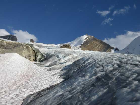 From the basecamp underneath Tusk Peak’s NW Ridge the first business was losing some elevation down to the flat Tusk Glacier in the middle of Mt. Clemenceau, Tusk Peak and Reconnaissance Ridge. The descent started by a bit of elevation gain over a ridge and then some slabby 4th class albeit on solid rocks. When we climbed Mt. Clemenceau a few days ago this down-climb felt sketchy but now with a very light pack I felt it quite easy. The snow bridge to hop onto the glacier had thinned considerably but I decided to trust it nonetheless and in short time I was down to the glacier. The plod across the glacier was monotonous but at least very scenic.
