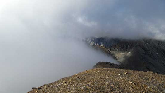 Towards the base of false summit we started contouring. There were a few scree bowls to traverse just like on Harrison, on ‘smaller’ terrain though. There really wasn’t much of hands-on scrambling but side-hill traverse was pretty tedious. Around the false summit we ascended to the ridge crest. The final push towards the true summit was long and foreshortened. There was one section we detoured to the left side looking for easier terrain but otherwise we stuck to the ridge crest. Near the top we entered clouds so the views from summit was very limited. It was very cold too.