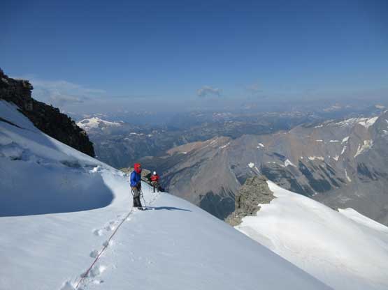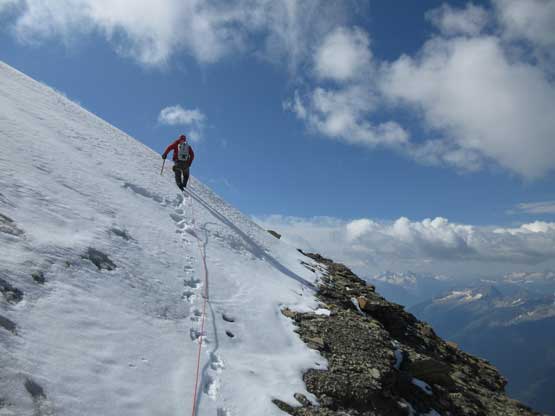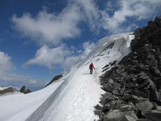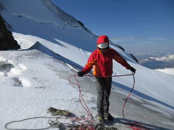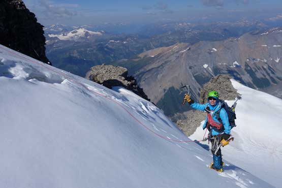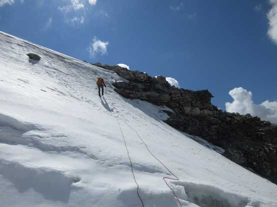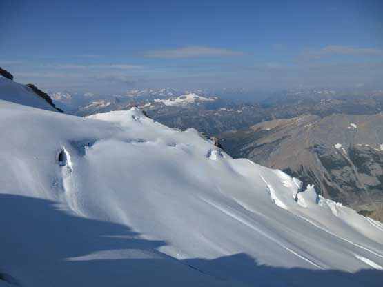 What seemed like a tame glacier from below turned out having quite a few crevasses especially on the near side so we played cautiously and roped up. Meanwhile this highest notch on the north ridge provided a natural platform to take a lengthy break. I believe we stopped there for at least half an hour and this allowed Robb and Raff to catch up. They had rapped off that big boulder onto the lower glacier and meanwhile we just started the horizontal traverse over towards the uppermost west ridge. The crevasses on the near side were indeed troublesome and the snow bridges were too soft to trust. Eventually after trying around Jeff picked a questionable bridge and went for it. It held for Jeff and Lyle but I put one leg into the hole on the 3rd crossing. Crossing the bergschrund on the far side (near west ridge) also had some questionable snow bridges that required a lot of probing to trust. To gain the west ridge we had to climb a pitch of steep ice right off the bat. Jeff made it look easy and belayed the two of us up. Meanwhile Robb and Raff had caught up to the same position and we climbed in more-or-less a group-of-5 for the rest of this ascent.
