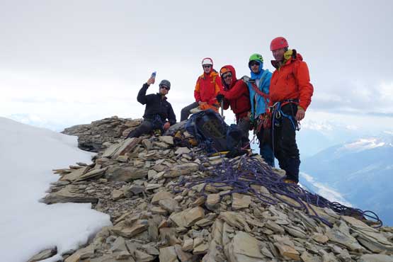 The upper west ridge was much more complicated than I thought. This is largely due to the conditions. On a dry year like this one much of the ridge had turned into ice climbing and there are several pitches of those. The three of us did some running belays and swinging leads and I got the oppourtunity to lead the second (longest) pitch on some dirty black ice while Jeff handled the other two short pitches. I was very glad to be wearing the Nepal Evos with steel crampons, and have hauled two ice tools otherwise I wouldn’t have felt comfortable on this type of terrain. Much of the ridge required great caution even on the uppermost slopes. The slope was no more than 35 degrees but we were walking on “snice” hence slipping was not optional. The highest point is on a snowy hump and we took a long break on an adjacent rocky ridge immediately to the south – congratulations to Robb for finishing the 58 11,000ers!