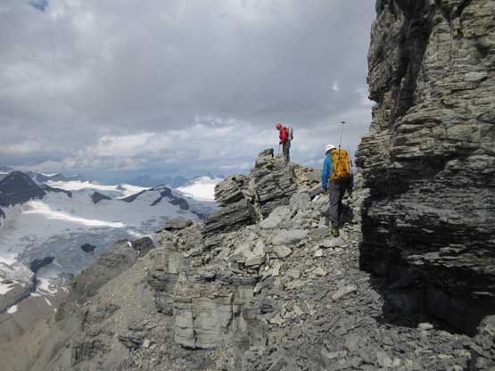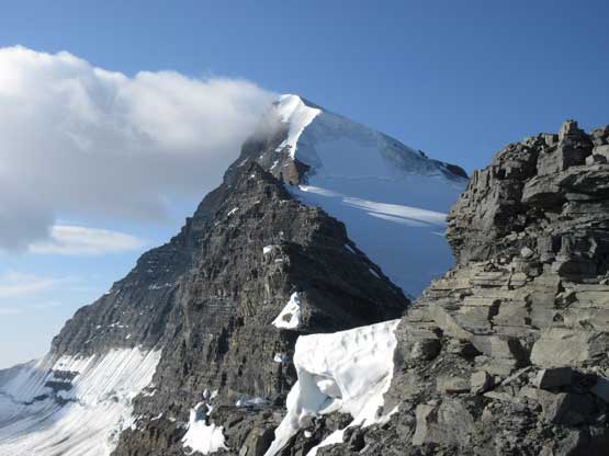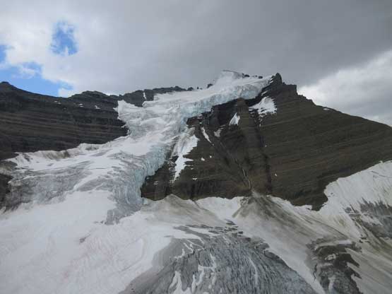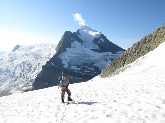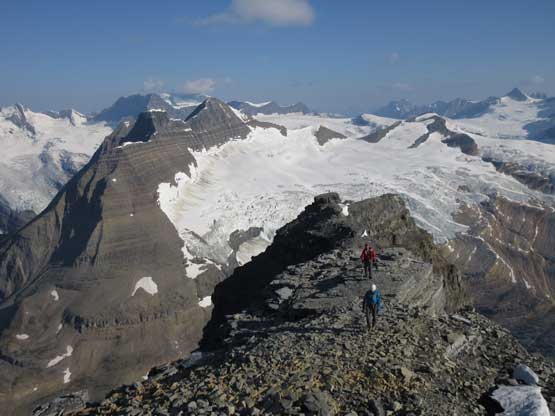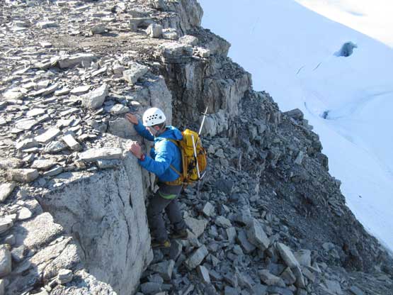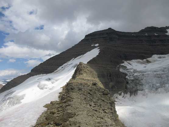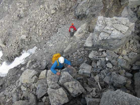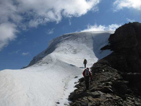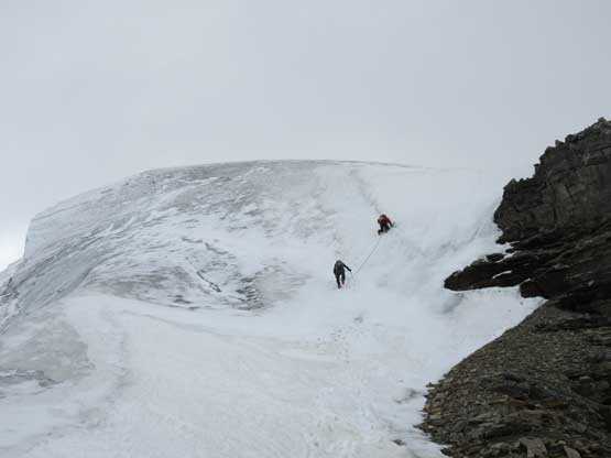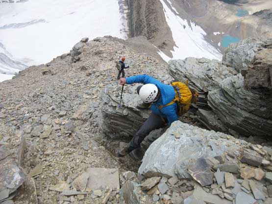 The next section was a pleasant surprise as we walked across the top of the north ridge’s west spur. The ridge crest was very broad and pretty much flat and we got to see the impressive north glacier up-close. There is one steep step requiring 3rd class climbing on loose rock but elsewhere was nice and easy. Towards the “headwall” feature I opted to put crampons on and ascend on snow while Jeff and Lyle decided to stay on rock. In terms of efficiency I think we were the same. To gain the North Ridge proper we had to find a way up the headwall. We all had some concerns about this section but it turned out to be nothing harder than 3rd-4th class. The hardest step was a wet, down-sloping corner (4th class) near the bottom and the exposure was quite mild the whole way.