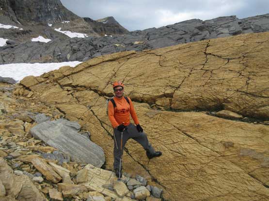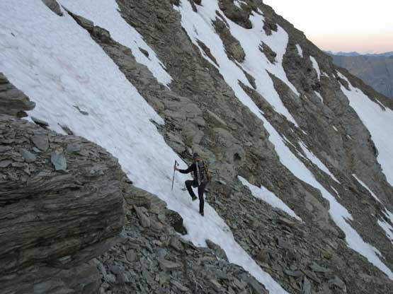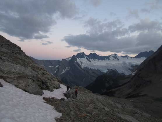 The next day (Aug. 6) was time for Tsar Mountain. We had spent two days making detailed plans about how were we going to attack it. First was the division of group. It made no sense to travel together in a group-of-7 due to rock falls so the division was Jeff, Lyle and I going ahead followed by Robb and Raff and then Gen and Pedro. For gears we had to haul glacier and ice climbing equipment because the summit block appeared very icy. The lower mountain required a bit of mapping and everyone eventually agreed to use a zig-zagging line far on climber’s right (west) side to gain the broad bench on N. Ridge’s West Spur. Everybody woke up at around 4:30 – 5 am and started the day in about an hour. The headlamps were only briefly required and we all made good progress on the lower slopes. There’s some route-finding but nothing major and eventually we all merged into a snow bowl. Ascending snow was far easier but did require taking the ice axe or crampons out, and the transition back onto rock was a little unpleasant.