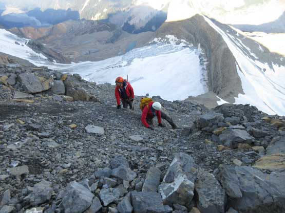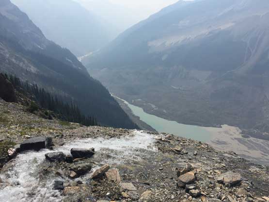 On the descent we decided to down-climb for as much as possible because several of the pitches didn’t have obvious anchors to rappel off. For the black ice pitch I down-led using a single ice tool and placed an ice screw about half way down. Lyle and Jeff are much better ice climbers and no issue getting down. At the top of the last pitch we tied the two 30m ropes together and this rappel also got us across the troublesome bergschrund with that added safety factor. The rest of the glacial descent went without incidence and then it’s time to reverse that long 3rd-4th class north ridge scramble. To be honest I felt it was quite enjoyable probably due to the downwards direction. Descending that headwall sucked as expected but at least short-lived, but then walking back across the west spur was again, nice and scenic. To get off the lower mountain we took a different line avoiding that steep snow section and this worked out perfectly.