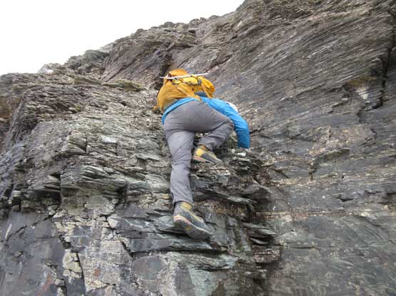 Gaining the north ridge proper was one of the highlights on this ascent – superb and aesthetic position with an exciting ridge ahead of us. Much of the next stage reminded me the upper mountain on Mt. Murchison but at least 2 times longer than Murchison. The rocks are mostly horizontal dinner-plate shale and the scrambling can be broken down into endless series of 3rd-4th class steps. Most of the impassible towers are bypassed on climber’s right (west) side and micro-terrain route-finding played an important role to move efficiently. We did encounter a few climbing steps but I believe all of those could be bypassed, if we looked for that. Wherever “climbing” is required I found the rocks were relatively solid. After what seemed like a long while we reached a shallow notch with a big boulder. It appeared we could have rappelled off that boulder to reach the upper glacier but the decision was to continue scrambling over another tower to the highest point on this north ridge. This was a poor decision because we got ourselves into the least enjoyable terrain of the whole ridge. We made across nonetheless but swore to use the lower notch on the return…