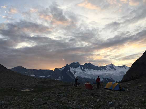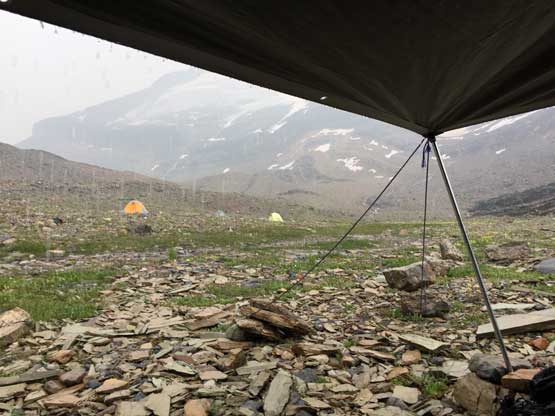 The next day I was supposed to rest but at around 2 pm I made a spontaneous decision to explore the bench on the west side of Mt. Somervell. The main reason was to kill time but I also wanted to search for a reasonable route getting down into Kinbasket River valley. I spent at least 5 hours exploring and the conclusion is that I could not come up with a conclusion. The steep moraine at the bottom could be a show stopper but there’s only one way to tell the truth.. The bonus was that I got a head-on view of the icefalls and glaciers on the south side of Mt. Shackleton. Eventually after getting enough of the views I slowly but steadily hiked back to camp (which involved ~200 m elevation regain) and then had a leisure dinner. Everyone else was taking a rest day so the evening was again, very relaxed. But to be honest by this point I was already sick of the area and was eager to get out. The forecasts showed bad news for our pick-up day but thank to the collaboration with Tusk Peak’s group we were all stuck here. I’m sure the other group wanted to get out earlier too but there’s no way to communicate with each other… Lesson learnt.
