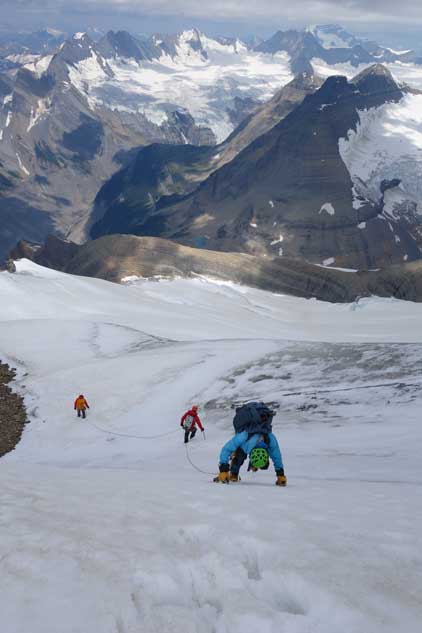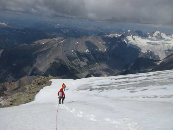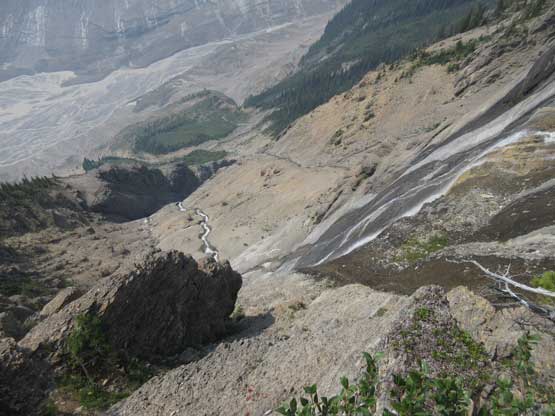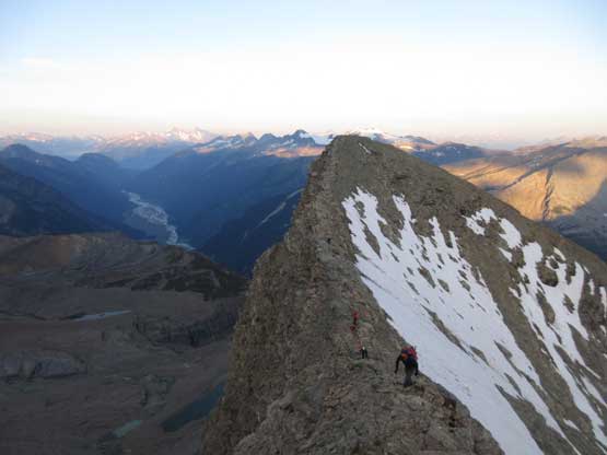 On the descent we decided to down-climb for as much as possible because several of the pitches didn’t have obvious anchors to rappel off. For the black ice pitch I down-led using a single ice tool and placed an ice screw about half way down. Lyle and Jeff are much better ice climbers and no issue getting down. At the top of the last pitch we tied the two 30m ropes together and this rappel also got us across the troublesome bergschrund with that added safety factor. The rest of the glacial descent went without incidence and then it’s time to reverse that long 3rd-4th class north ridge scramble. To be honest I felt it was quite enjoyable probably due to the downwards direction. Descending that headwall sucked as expected but at least short-lived, but then walking back across the west spur was again, nice and scenic. To get off the lower mountain we took a different line avoiding that steep snow section and this worked out perfectly.
