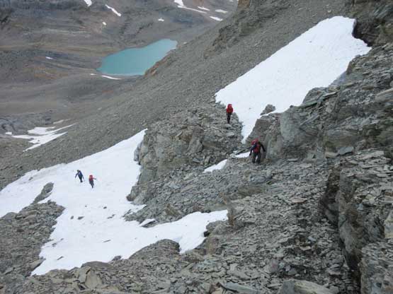 The next day (Aug. 6) was time for Tsar Mountain. We had spent two days making detailed plans about how were we going to attack it. First was the division of group. It made no sense to travel together in a group-of-7 due to rock falls so the division was Jeff, Lyle and I going ahead followed by Robb and Raff and then Gen and Pedro. For gears we had to haul glacier and ice climbing equipment because the summit block appeared very icy. The lower mountain required a bit of mapping and everyone eventually agreed to use a zig-zagging line far on climber’s right (west) side to gain the broad bench on N. Ridge’s West Spur. Everybody woke up at around 4:30 – 5 am and started the day in about an hour. The headlamps were only briefly required and we all made good progress on the lower slopes. There’s some route-finding but nothing major and eventually we all merged into a snow bowl. Ascending snow was far easier but did require taking the ice axe or crampons out, and the transition back onto rock was a little unpleasant.
