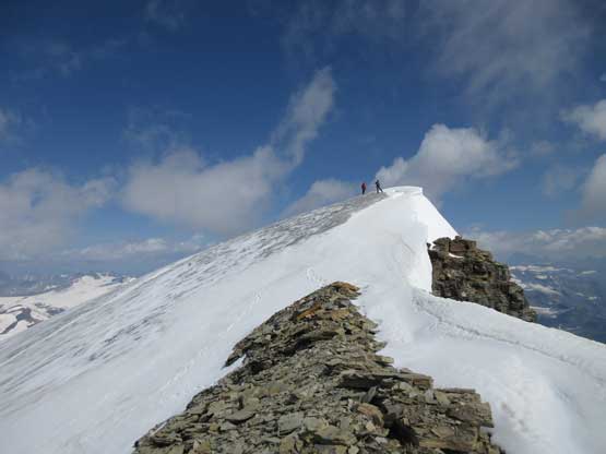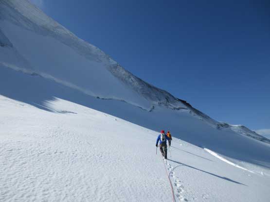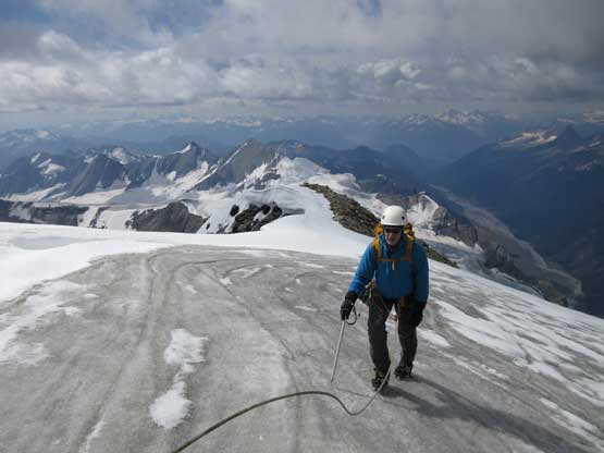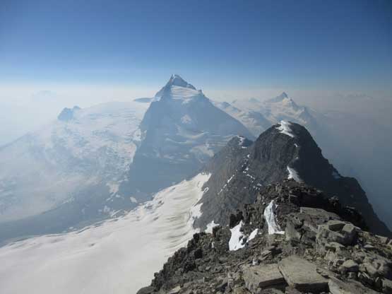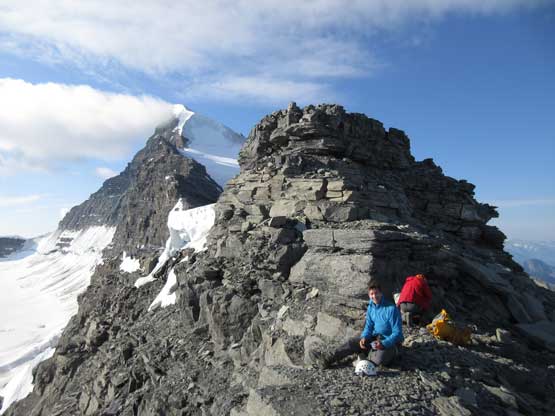 The upper west ridge was much more complicated than I thought. This is largely due to the conditions. On a dry year like this one much of the ridge had turned into ice climbing and there are several pitches of those. The three of us did some running belays and swinging leads and I got the oppourtunity to lead the second (longest) pitch on some dirty black ice while Jeff handled the other two short pitches. I was very glad to be wearing the Nepal Evos with steel crampons, and have hauled two ice tools otherwise I wouldn’t have felt comfortable on this type of terrain. Much of the ridge required great caution even on the uppermost slopes. The slope was no more than 35 degrees but we were walking on “snice” hence slipping was not optional. The highest point is on a snowy hump and we took a long break on an adjacent rocky ridge immediately to the south – congratulations to Robb for finishing the 58 11,000ers!